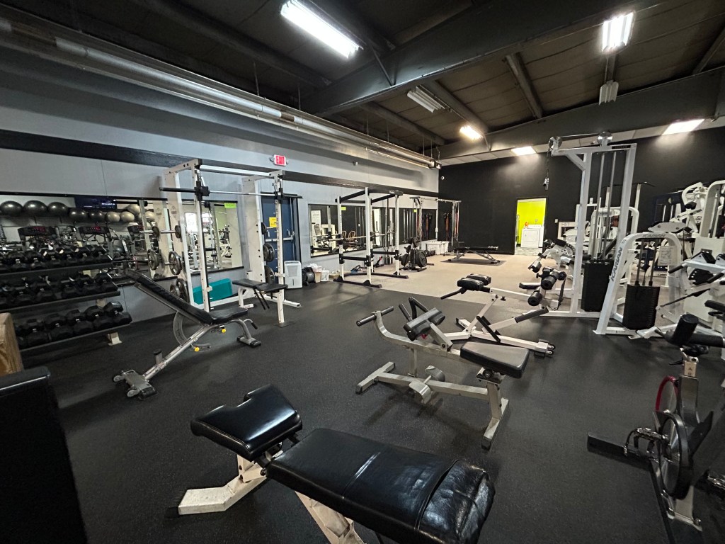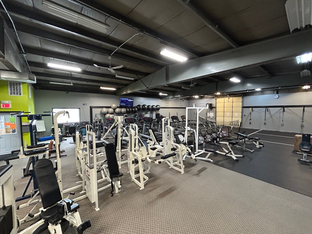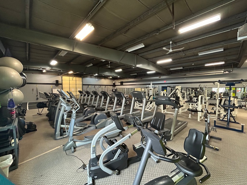 TRX straps, dumbbells, ellipticals, recumbent bikes, airdyn bikes, treadmills, stationary bikes, benches, and multiple machines covering multiple muscles – chest, abs, legs, and back. Also have a cable rack and smith machine.